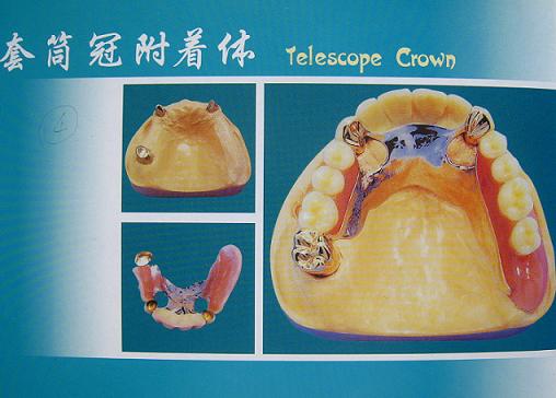 利用套筒冠的內(nèi)外雙重冠結(jié)構(gòu),把假牙與基牙連接起來的修復(fù)形式。套筒冠由內(nèi)冠和外冠組成,內(nèi)冠粘固在基牙上,外冠與假牙其他組成部分連接成整體,義齒通過內(nèi)冠與外冠之間的嵌合作用產(chǎn)生固位力,使義齒取得良好的固位 -